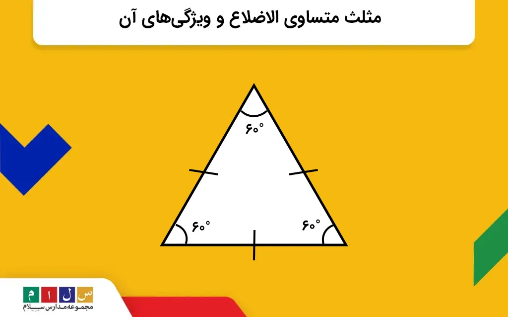 - ۳ زاویه مثلث متساویالاضلاع با هم مساویاند. باتوجه به اینکه جمع زوایای داخلی مثلث ۱۸۰ درجه است، پس هر کدام از زوایای مثلث متساویالاضلاع ۶۰ درجه دارند.