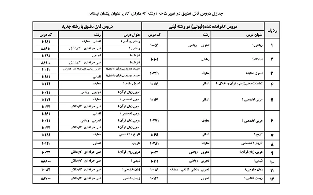 جدول تطبیق دروس تغییر رشته از پایه یازدهم به دوازدهم
