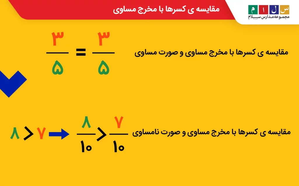 - اگر صورتها مساوی باشند، کسرها نیز مساویاند.