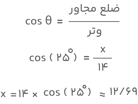 حال با استفاده از تعریف کسینوس در بخش کسینوس چیست میتوانیم مقدار مجهول x را بهدست آوریم. دقت کنید که در اینجا زاویه حاده ۲۵ درجه است.
