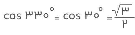 زاویه ۳۳۰ درجه در ربع چهارم که مقدار کسینوس مثبت است واقع شده است. ازاینرو، زاویه مرجع این زاویه بهصورت زیر محاسبه خواهد شد: