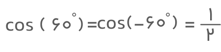 ۱) کسینوس تابعی زوج است. بهطور کلی، تابع f را تابعی زوج میگویند اگر (f (x)=f (-x باشد. به این معنی که اگر نمودار تابع f را نسبت به محور y بازتاب دهیم، همان نمودار بهدست خواهد آمد. با توجه به زوج بودن تابع کسینوس داریم: