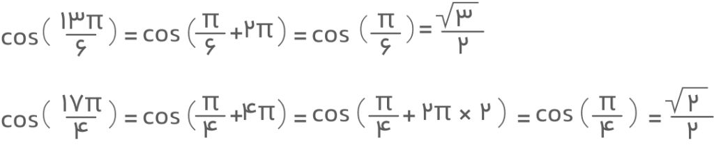 به دو مثال زیر نگاه کنید. در این مثالها با استفاده از خاصیت تناوبی کسینوس، مقدار کسینوس دو زاویه را محاسبه کردهایم.