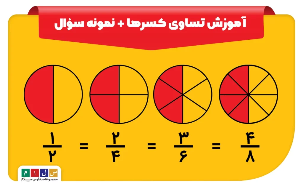 کسرهای مساوی به کسرهایی گفته میشود که مقدار یا نسبت یکسانی را نشان میدهند اما مقدار صورت و مخرج آنها با هم متفاوت است. چنین کسرهایی بعد از سادهسازی همگی به یک کسر یکسان یا معادل تبدیل میشوند.