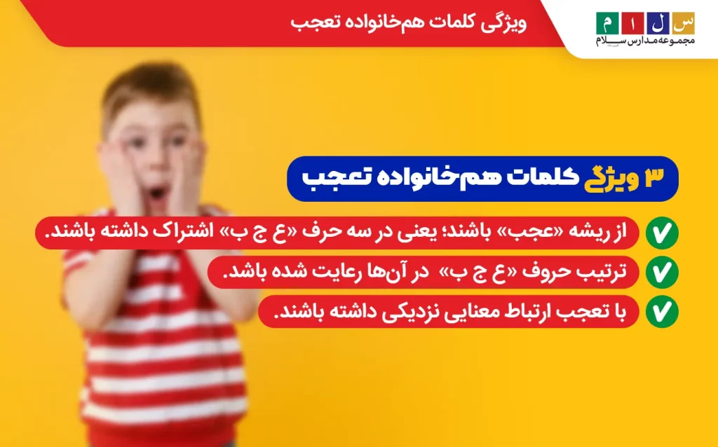 کلماتی را که در سه حرف «عجب» با هم مشترکاند، با تعجب ارتباط معنایی دارند و حروف «ع ج ب» در آنها بهترتیب آمده است، هم خانواده تعجب میگویند. - از کجا بدانیم کدام کلمه، هم خانواده تعجب است؟