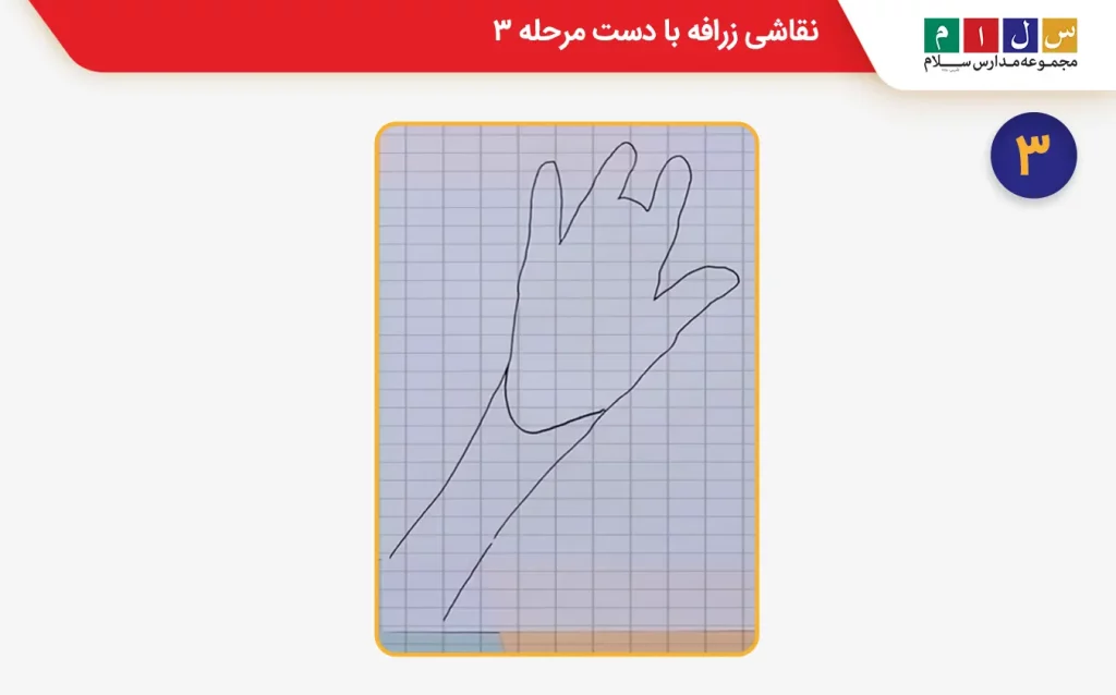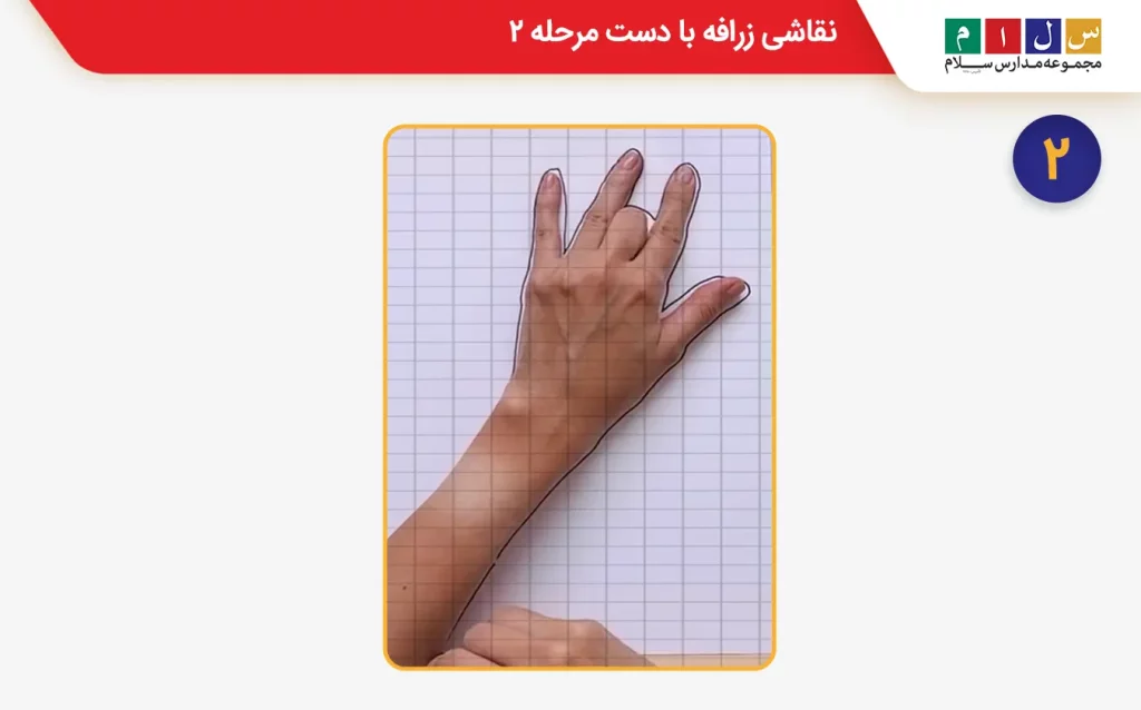 در این مرحله، کف دست خود را روی یک برگه سفید قرار دهید، به صورتی که انگشتان باز باشند و مچ دست در امتداد کاغذ قرار بگیرد. این حالت پایه‌ای برای طراحی بدن زرافه خواهد بود.