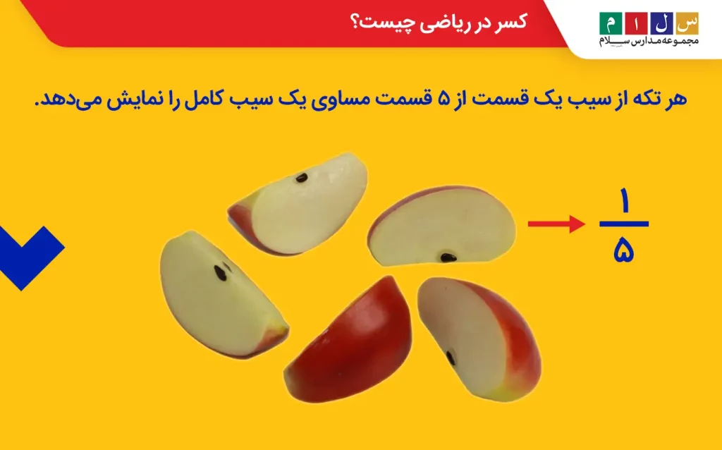 قبل از اینکه به معرفی ثلث در ریاضی بپردازیم، بهتر است با مفهوم کسر در ریاضی آشنا شویم. کسرها مقادیری هستند که بخشی از یک کل را نشان میدهند. برای مثال، اگر یک سیب را به ۵ قسمت مساوی تقسیم کنیم، هر تکه از سیب یک قسمت از ۵ قسمت مساوی یک سیب کامل را نمایش میدهد. بنابراین، کسر مربوط به هر تکه سیب را بهصورت (میخوانیم یکپنجم) مینویسیم. عدد بالایی یعنی ۱ را صورت کسر و عدد پایینی یعنی ۵ را مخرج کسر مینامیم. صورت و مخرج کسر بهوسیله یک خط که خط کسری نام دارد از هم جدا میشوند.