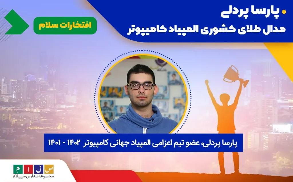 اقای پارسا پردلی بهروز دانشآموز سلامی پایه دوازدهم، با کسب مدال طلای المپیاد کشوری سال ۱۴۰۱- ۱۴۰۲ کامپیوتر، توانست برگی دیگر بر افتخارات مجموعه مدارس سلام در المپیاد بیفزاید. این دانشآموز ممتاز، یکی از اعضای تیم ملی المپیاد جهانی کامپیوتر خواهد بود که شهریور ماه سال ۱۴۰۲، در سی و پنجمین المپیاد جهانی ۲۰۲۳ مجارستان حضور پیدا میکند.