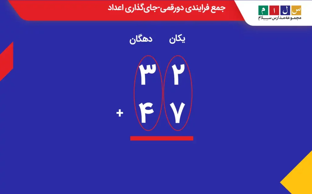 مرحله سوم: حالا نوبت جمع کردن یکیهاست. یکان عدد اول را با یکان عدد دوم بهصورت زیر جمع میکنیم تا حاصل جمع دو عدد ۳۲ و ۴۷ بهدست آید.