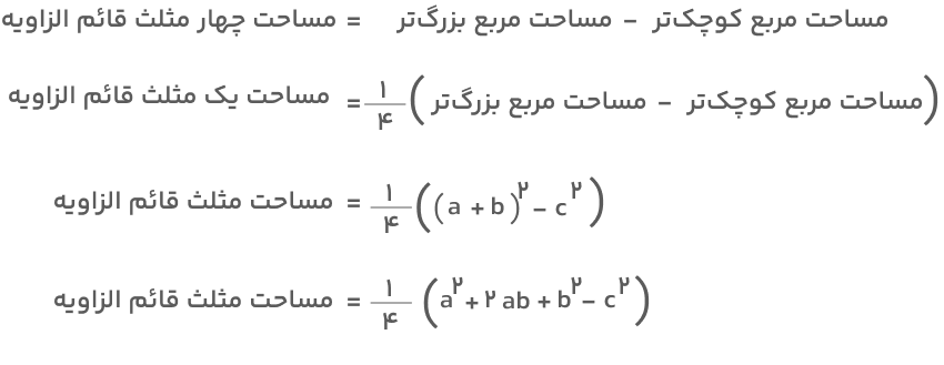 - مساحت مربع بزرگ برابر با a+b)۲) و مساحت مربع کوچک برابر با c۲ است. اگر مساحت مربع کوچکتر را از مساحت مربع بزرگتر کم کنیم، مساحت چهار مثلث قائمالزاویه بهدست میآید که با تقسیم آن بر عدد ۴ میتوان مساحت یک مثلث قائمالزاویه را محاسبه کرد.