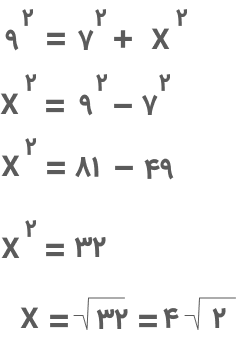 جواب: ازآنجا که یکی از سه زاویه مثلث قائمه است، برای تعیین مقدار x میتوانیم قضیه فیثاغورس را بهکار ببریم: