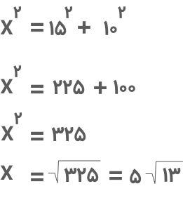 جواب: قطر مستطیل، مستطیل را به دو مثلث قائمالزاویه یکسان تقسیم میکند و بهعبارتی، وتر مثلثها محسوب میشود. اگر طول قطر را x در نظر بگیریم، با استفاده از قضیه فیثاغورس خواهیم داشت: