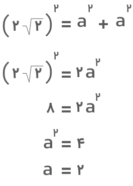 جواب: میدانیم که مساحت مربع از حاصلضرب ضلع آن در خودش بهدست میآید. با توجه به اینکه مربع اضلاع برابر دارد و قطر آن با دو ضلعش یک مثلث قائمالزاویه میسازد، میتوانیم از قضیه فیثاغورس کمک بگیریم. فرض میکنیم ضلع مربع a است. در این صورت طبق قضیه فیثاغورس خواهیم داشت: