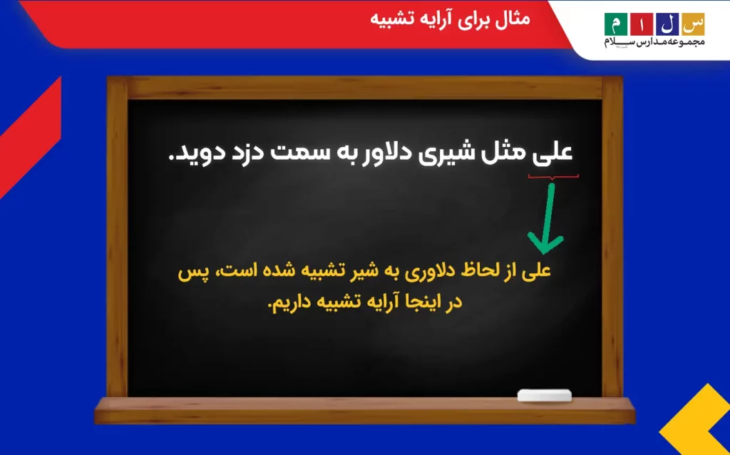 در حال توضیح افتخارآفرینیهای دانشآموزان سلام در عرصههای مختلف تحصیلی و پژوهشی مانند کنکور هستیم و آنها را به ستارگانی درخشان توصیف کردهایم. در اینجا دانشآموزان سلام مشبه هستند، چون آنها را به ستارگان تشبیه کردهایم. همینجا یک پل هم به آرایه استعاره بزنیم و اضافه کنیم که «هر گاه مشبه به همراه یکی از ویژگیهای مشبهبه بیاید»، استعاره مصرحه داریم.