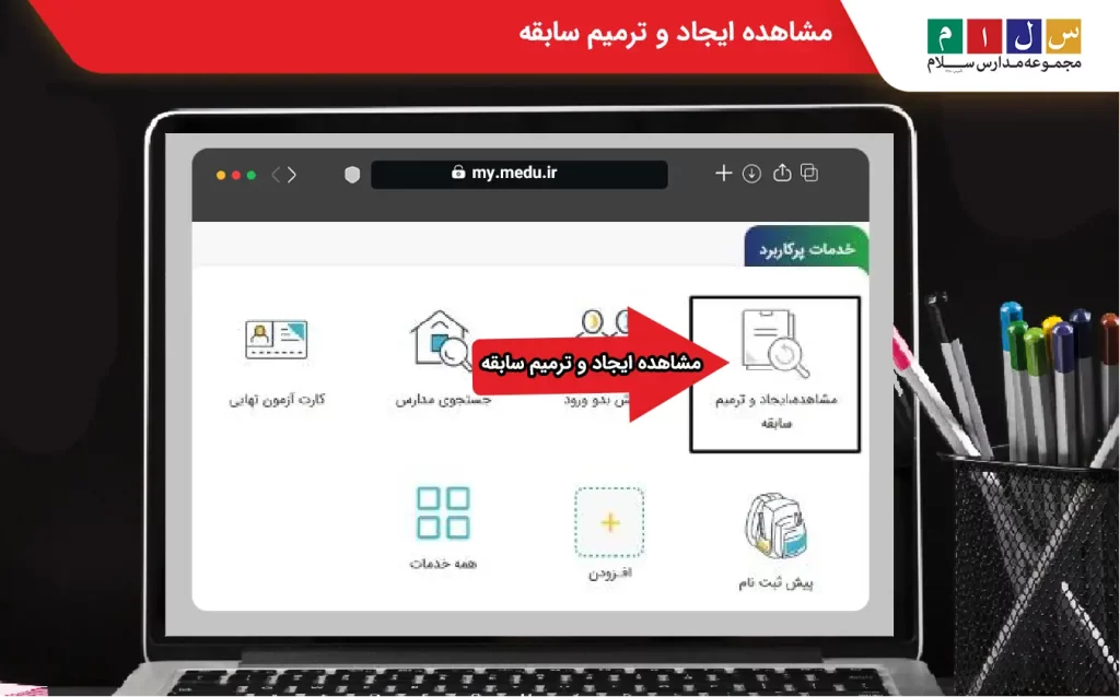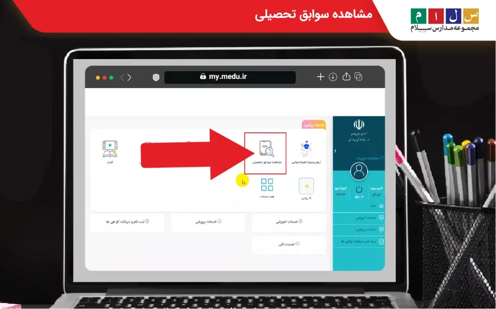 بعد از ورود به سامانه مایمدیو، گزینه «مشاهده سوابق تحصیلی» را پیدا کنید و روی آن بزنید.