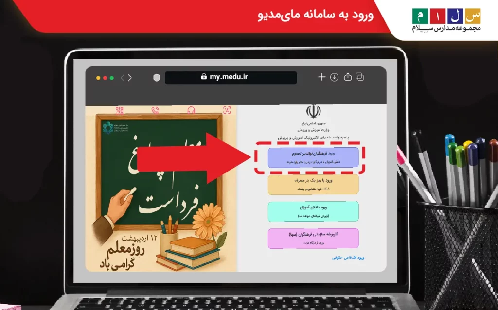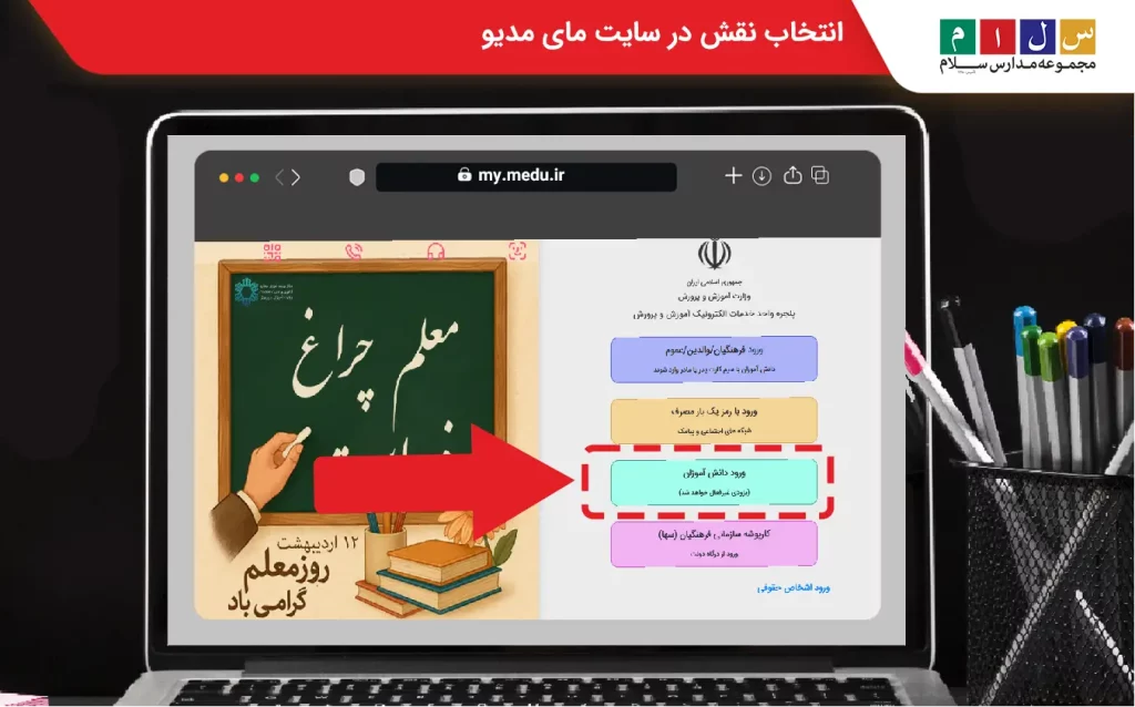از طریق سایت www.mymedu.ir وارد شوید و نقش کاربری مناسب (دانشآموز یا والدین و سایر) را انتخاب کنید.
