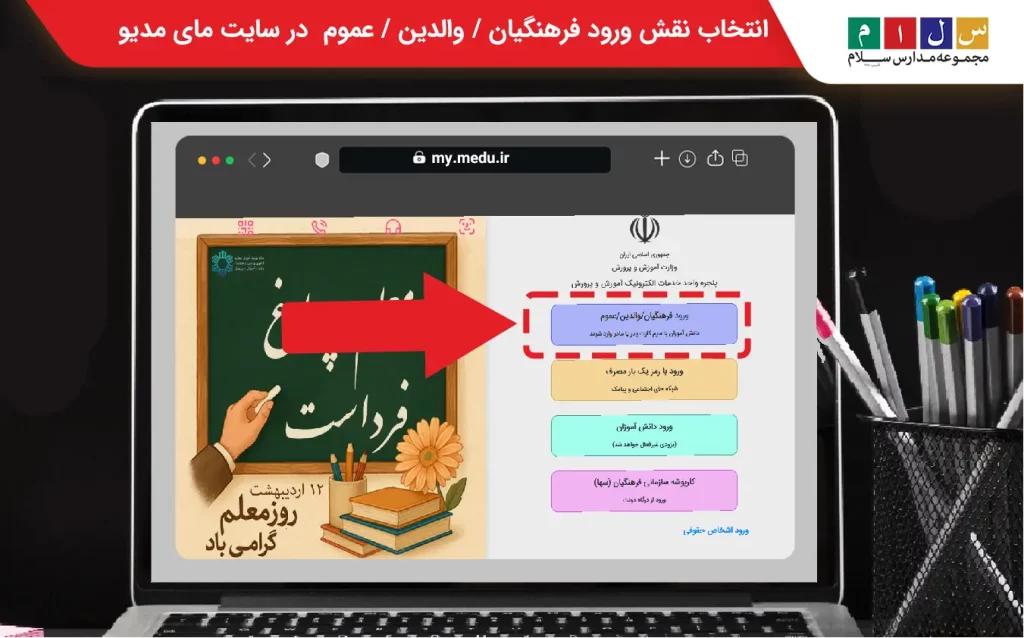 ۱.ورود به سایت مای مدیو و انتخاب گزینه «ورود فرهنگیان / والدین / عموم »