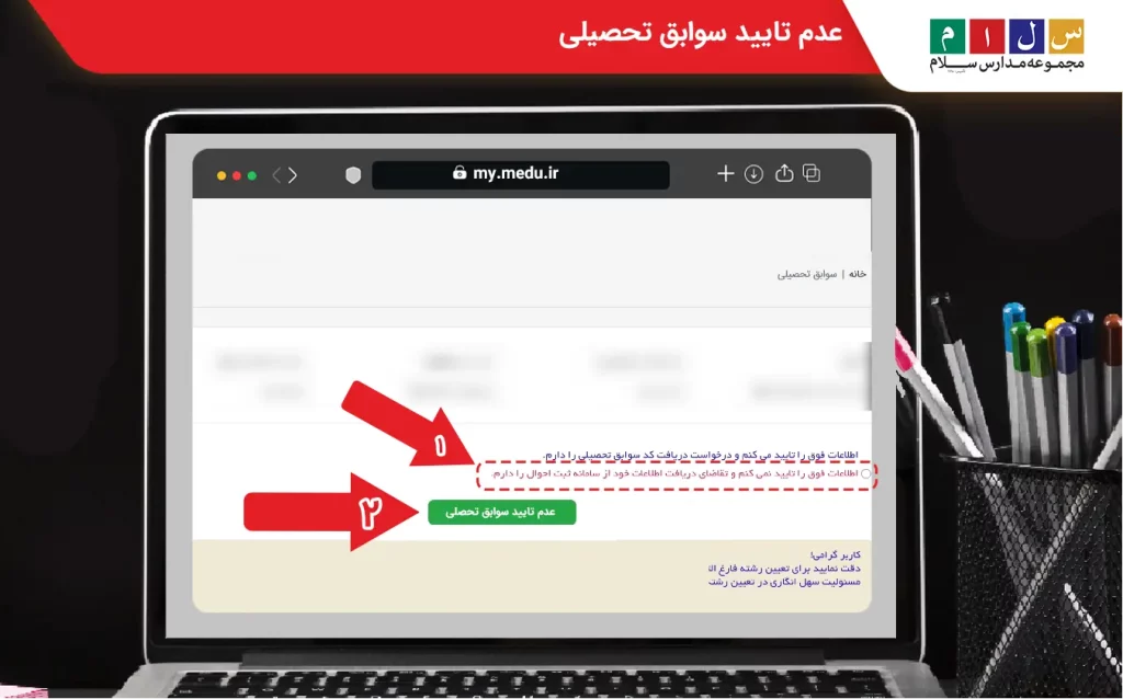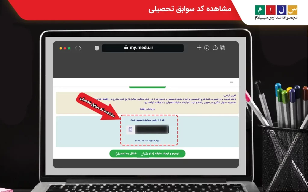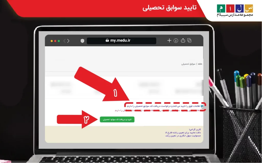 گزینه مربوط به «اطلاعات فوق را تایید میکنم و درخواست دریافت کد سوابق تحصیلی را دارم.» را علامت بزنید و روی دکمه سبزرنگ «تایید و دریافت سوابق تحصیلی» کلیک کنید.