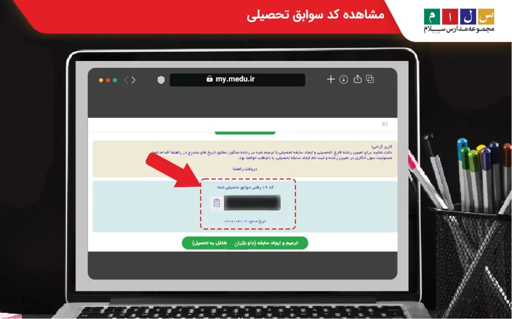 برای ثبتنام در کنکور سراسری یا تأیید سوابق تحصیلی در سامانههای وابسته به وزارت آموزش و پرورش، ارائهی کد ۱۹ رقمی سوابق تحصیلی الزامی است. این کد از سوی وزارت آموزش و پرورش صادر شده و نشاندهندهی سابقهی تحصیلی داوطلب است.