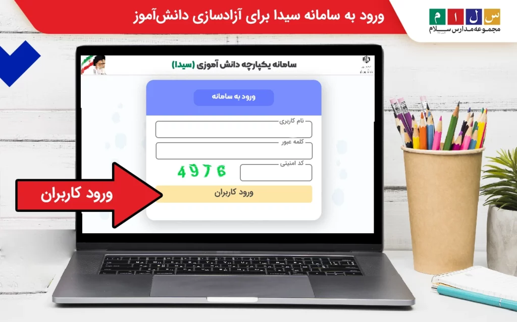 ابتدا از طریق مای مدیو mymedu.ir وارد سامانه سیدا به آدرس اینترنتی sida.medu.ir شوید. سپس نام کاربری و رمز عبور خود را وارد کنید. در صورت نیاز به بازیابی رمز، با مدیر مدرسه تماس بگیرید و در پایین صفحه کد امنیتی نمایش داده شده را وارد کنید. اگر کد خوانا نیست، روی آیکون فلش کلیک کنید تا کد جدید تولید شود.