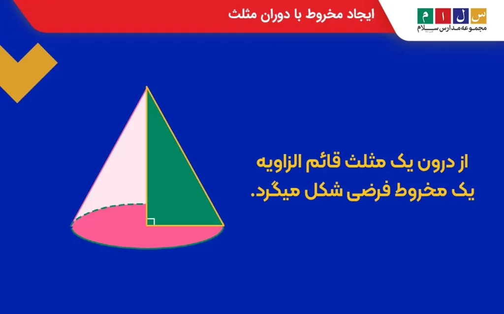 اگر یک مثلث قائمالزاویه را مانند شکل زیر حول یکی از دو ضلع زاویه قائمه بهاندازه ۳۶۰ درجه دوران دهید، یک شکل سهبعدی فرضی بهنام مخروط شکل میگیرد.