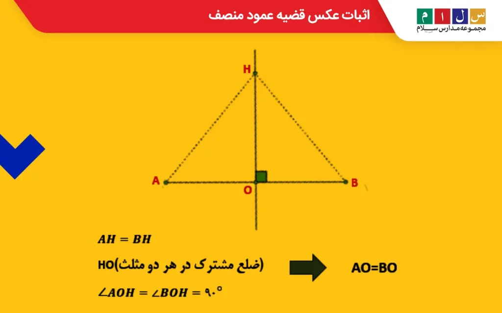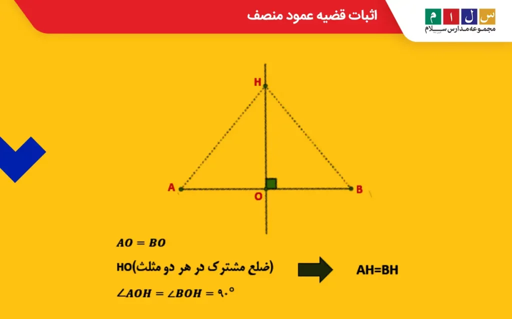 بنابراین، دو مثلث با داشتن دو ضلع و یک زاویه برابر (ض ز ض) هم‌‌نهشت محسوب می‌‌شوند. به‌‌این‌‌ترتیب، AH=BH است. این یعنی اینکه نقطه H از دو سر پاره‌‌خط AB فاصله یکسانی دارد.