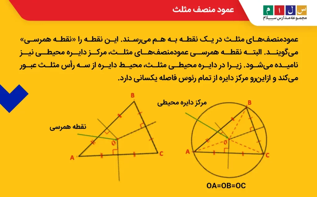 عمودمنصف‌‌های مثلث در یک نقطه به هم می‌‌رسند. این نقطه را «نقطه همرسی» می‌‌گویند. البته نقطه همرسی عمودمنصف‌‌های مثلث، مرکز دایره محیطی نیز نامیده می‌‌شود. زیرا در دایره محیطی مثلث، محیط دایره از سه رأس مثلث عبور می‌‌کند و از این‌‌ رو مرکز دایره از تمام رئوس فاصله یکسانی دارد. تصویر زیر این موضوع را به‌‌خوبی نشان می‌‌دهد.