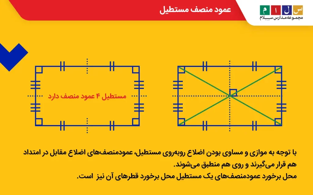 براساس تعریف عمود منصف، عمود منصف مستطیل خطی عمود بر اضلاع مستطیل است که ضلع‌‌ها را به دو قسمت مساوی تقسیم می‌‌کند. از آنجا که مستطیل از چهار ضلع ساخته شده است، این شکل هندسی دارای چهار عمود منصف خواهد بود. با توجه به موازی و مساوی بودن اضلاع روبه‌‌روی مستطیل، عمودمنصف‌‌های اضلاع مقابل در امتداد هم قرار می‌‌گیرند و روی هم منطبق می‌‌شوند.