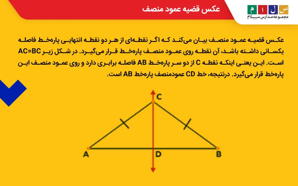 عکس قضیه عمود منصف بیان می‌‌کند که اگر نقطه‌‌ای از هر دو نقطه انتهایی پاره‌‌خط فاصله یکسانی داشته باشد، آن نقطه روی عمود منصف پاره‌‌خط قرار می‌‌گیرد. در شکل زیر AC=BC است. این یعنی اینکه نقطه C از دو سر پاره‌‌خط AB فاصله برابری دارد و روی عمود منصف این پاره‌‌خط قرار می‌‌گیرد. درنتیجه، خط CD عمودمنصف پاره‌‌خط AB است.