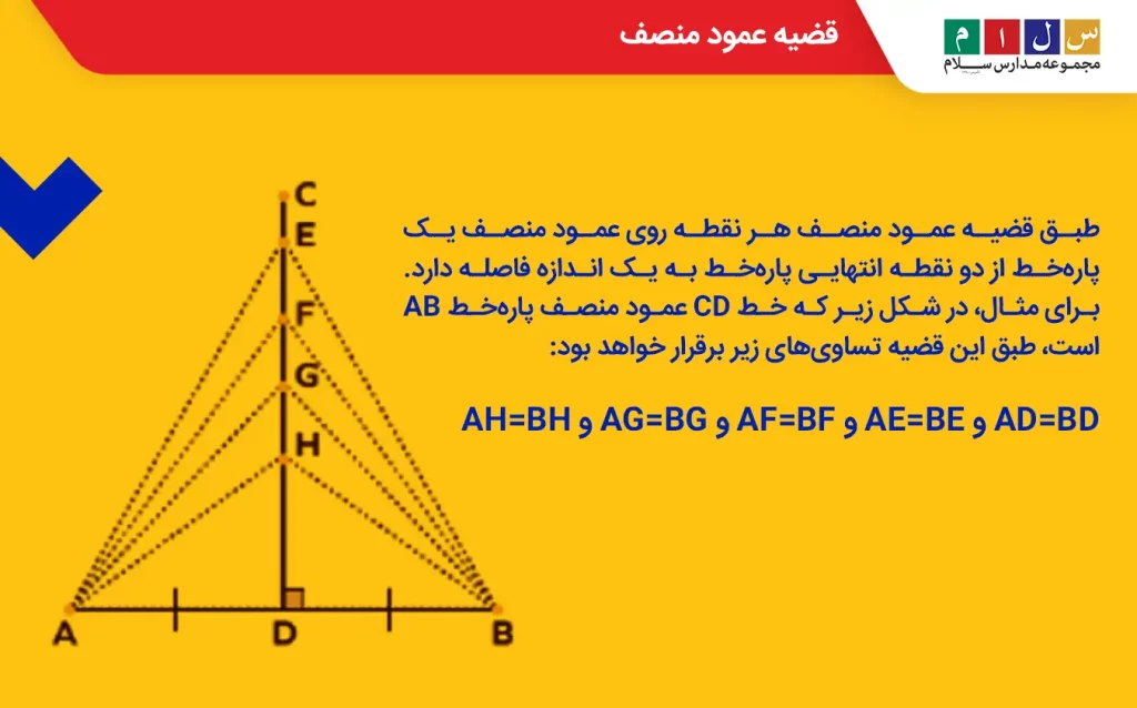 • هر نقطه از عمود منصف از دو سر پاره‌‌خطی که بر آن عمود شده است فاصله یکسانی دارد.
