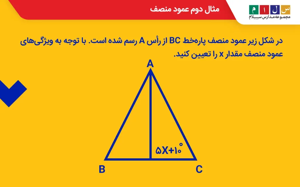 جواب: از آنجا که عمود منصف بر پاره‌‌خط BC عمود است، باید زاویه ۵x+۱۰ را برابر با ۹۰ درجه قرار دهیم.