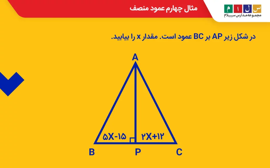 مثال ۳: اگر AP عمود منصف BC باشد، مقدار x چقدر است؟